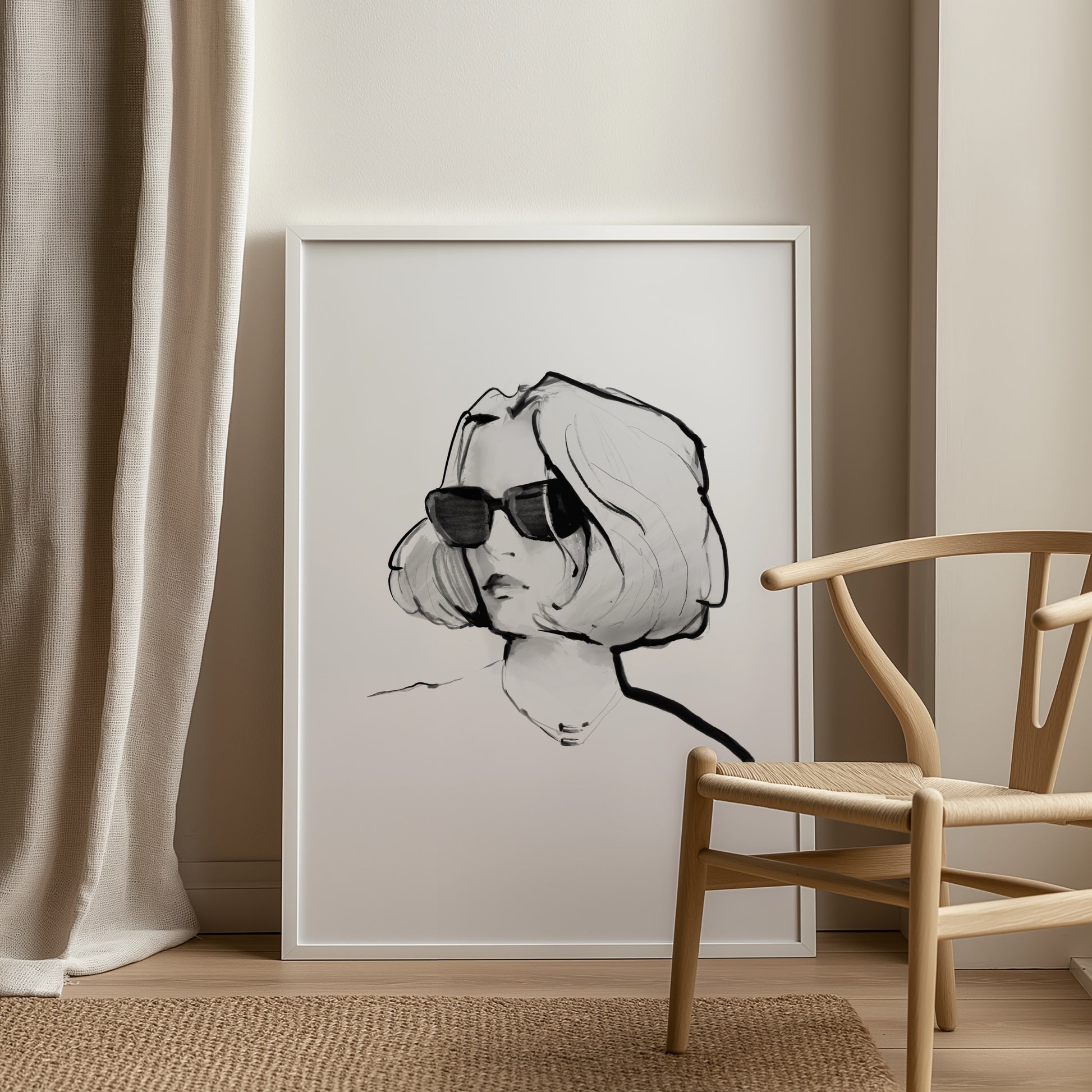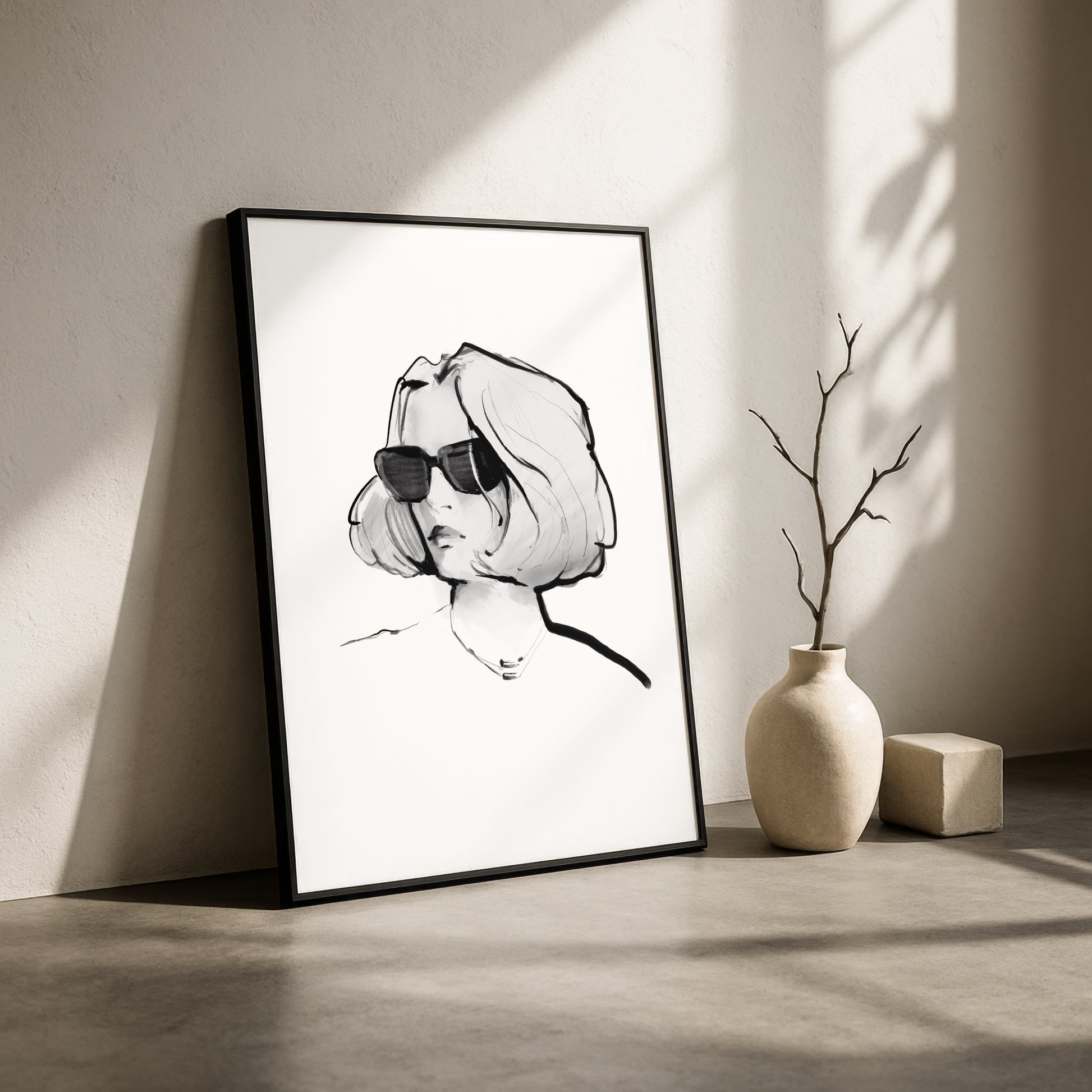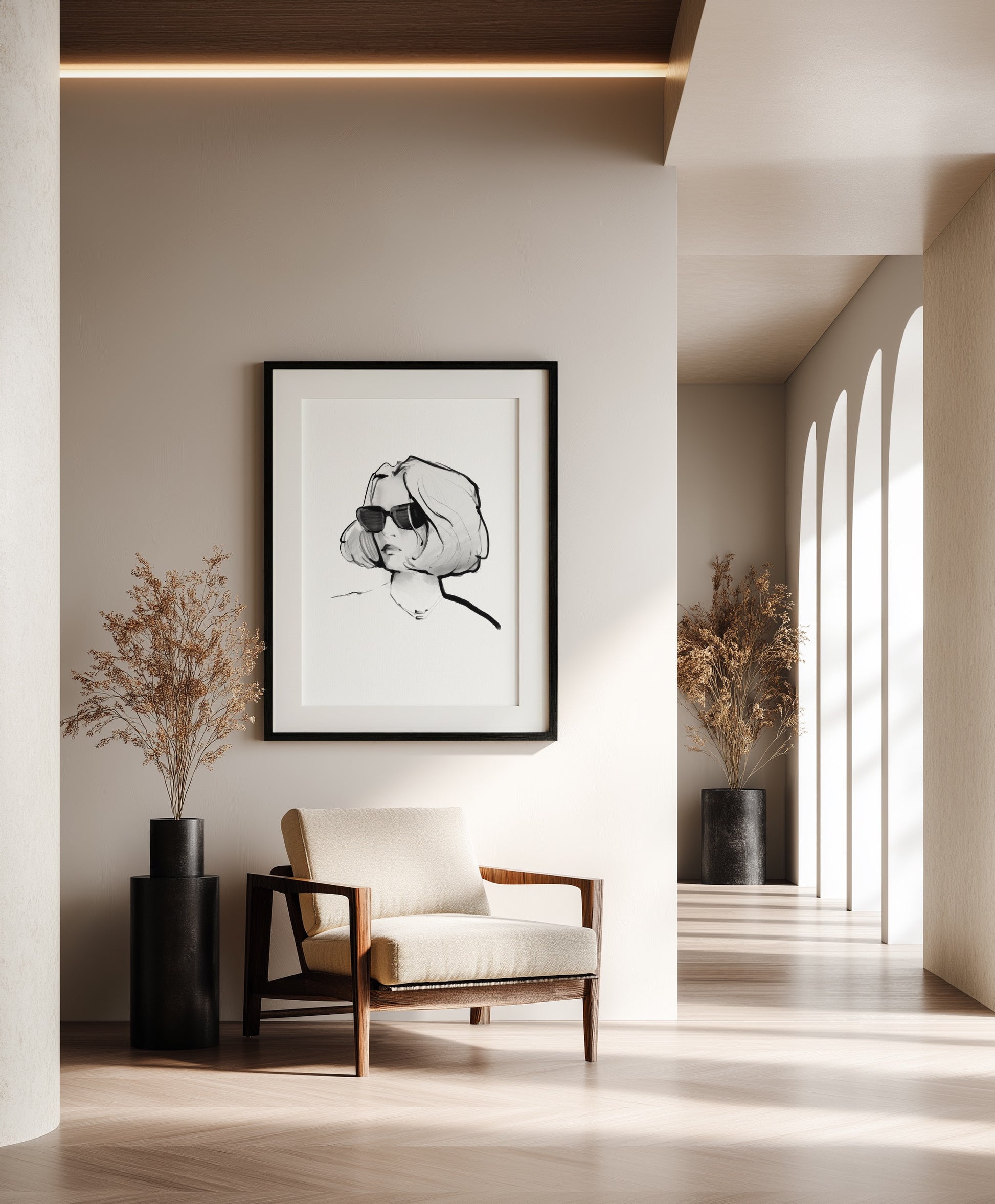 Minimalistyczna, czarno-biała ekspresyjna kompozycja podkreśla sylwetkę i wizualną równowagę, dzięki czemu praca naturalnie wpisuje się w nowoczesne wnętrza.